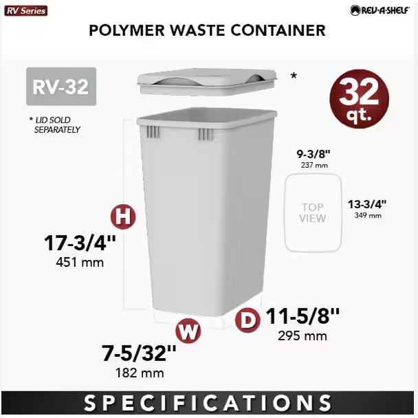 what are the dimensions of the 32 quartz garbage bin? Rev-A-Shelf 32 Quart White Replacement Waste Bin Bulk-8 Rev-A-Shelf RV-32-11-8 Trash Pull-Outs: Replacement Pull-Out Bins and Accessories